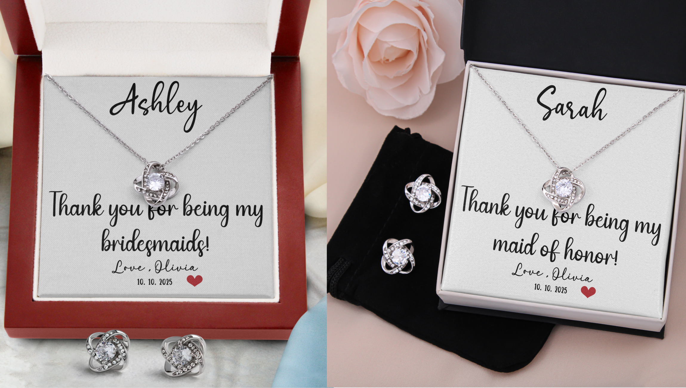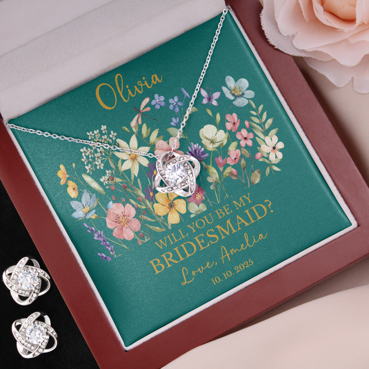 Personalized Bridesmaid Jewelry Proposal Gift Set – Love Knot Necklace & Earrings with Heartfelt Message Card