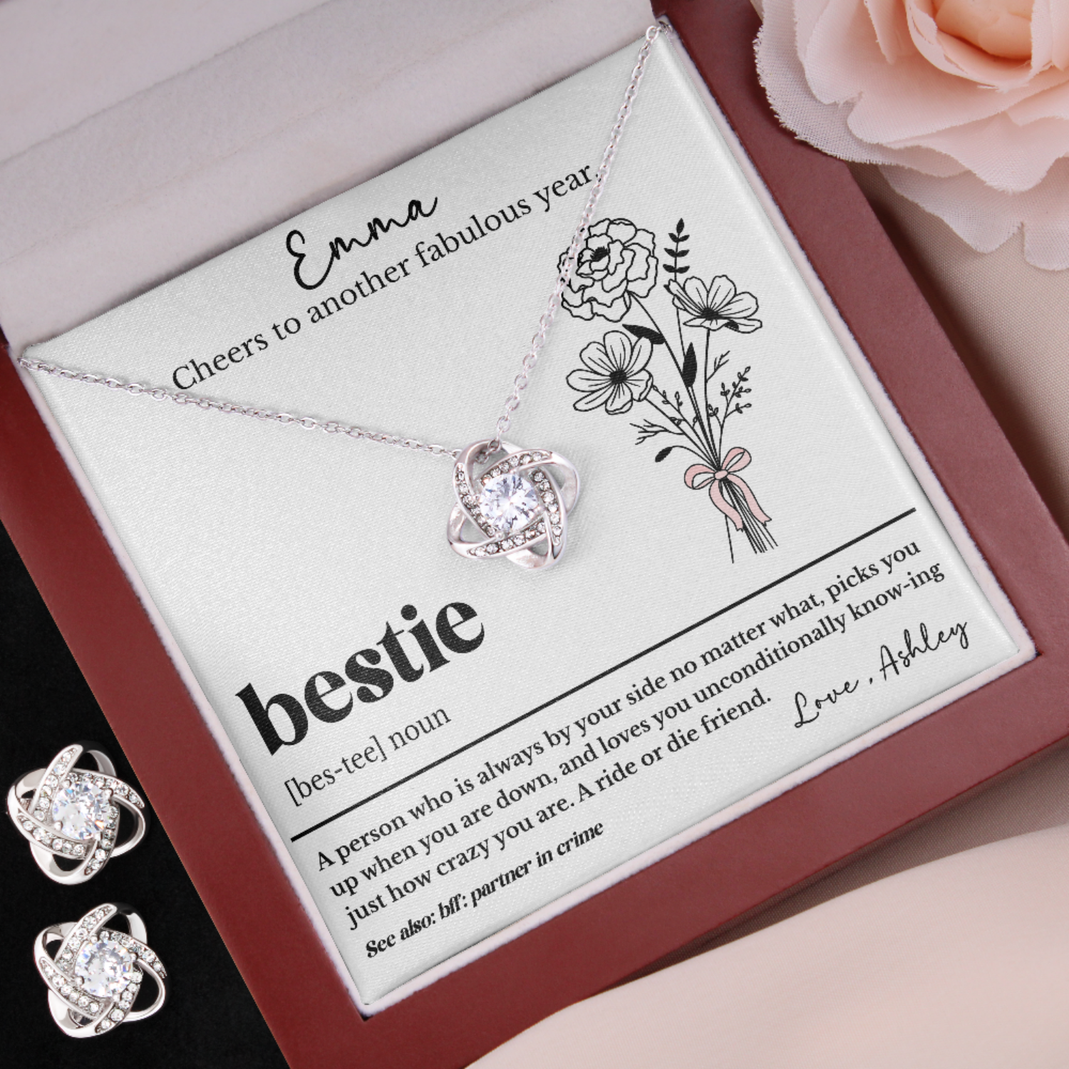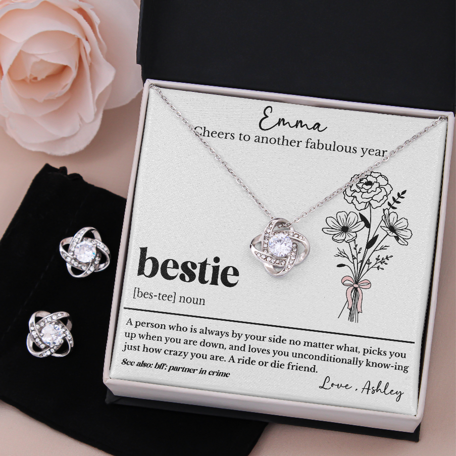 Celebrate your closest friendship with this personalized bestie birthday necklace gift set, perfect for showing love and appreciation. The custom message card features a heartfelt definition of “bestie,” a beautiful birth flower illustration, and a warm birthday wish that can be personalized with your friend’s name and your own signature.