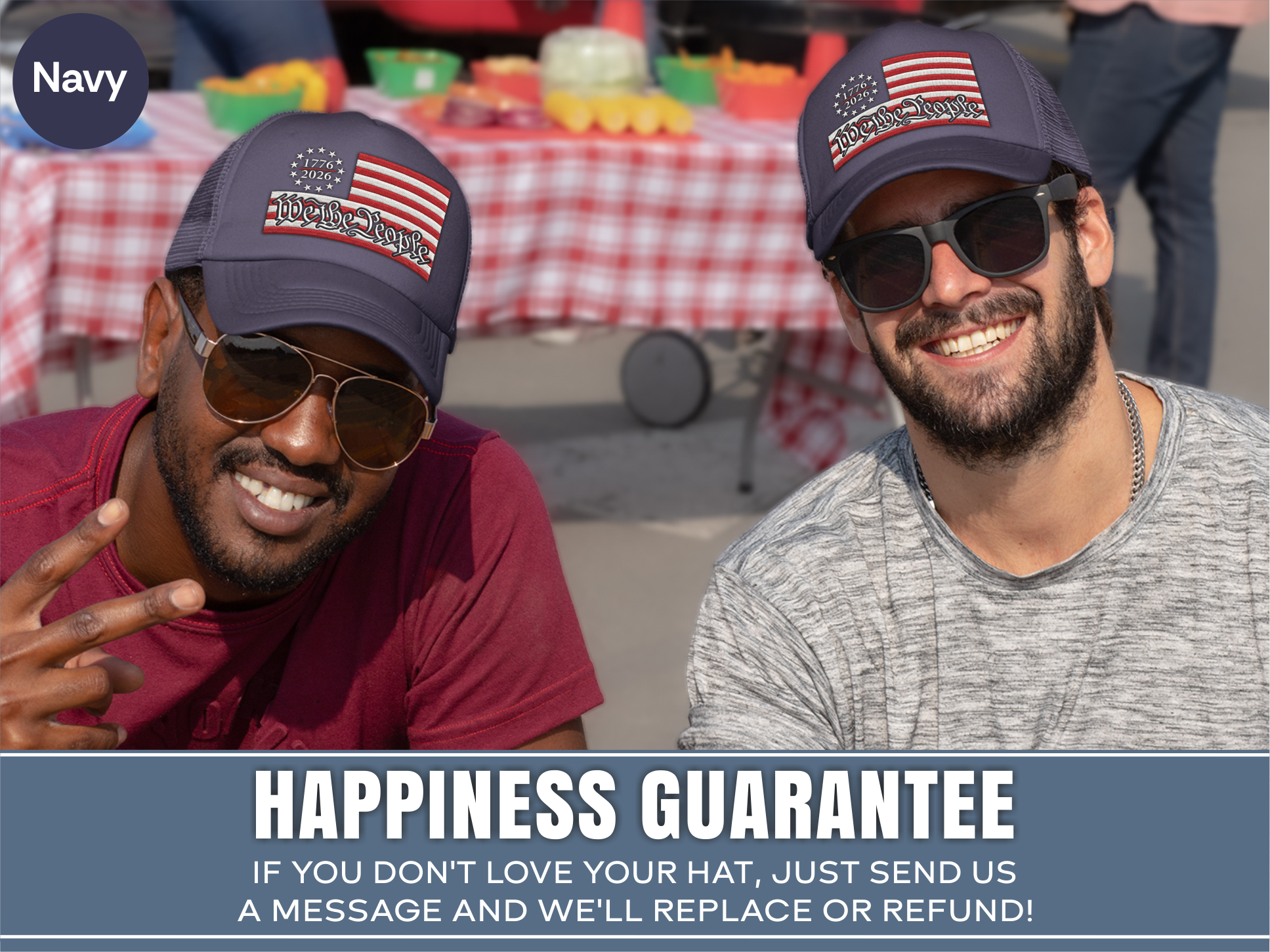Crafted with a high-density, non-toxic foam front and breathable mesh back, this hat delivers both structure and all-day comfort. The high-profile, 5-panel design gives it a timeless trucker look, while the detailed embroidery adds a premium, heritage-inspired touch that proudly represents America’s 250-year legacy.